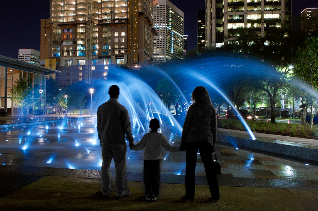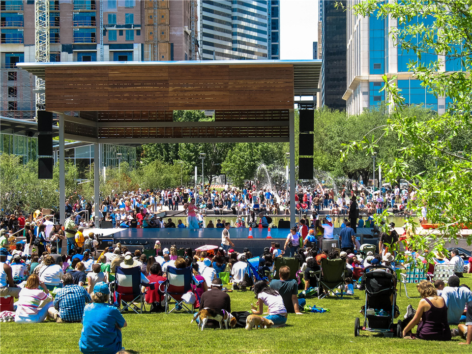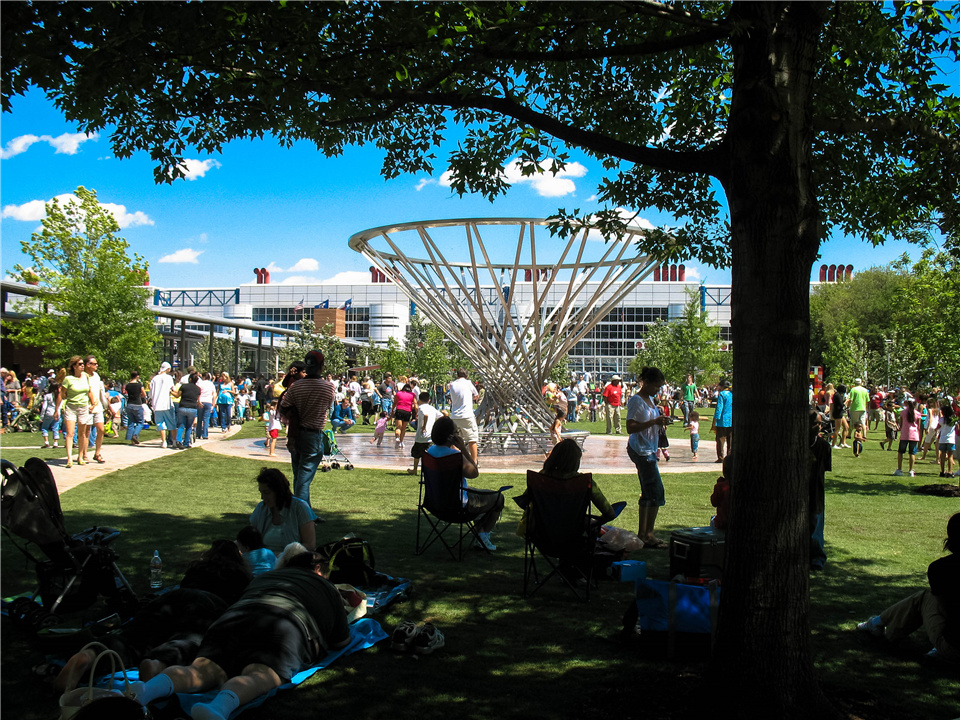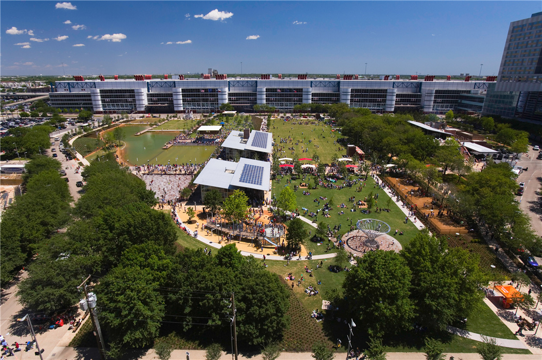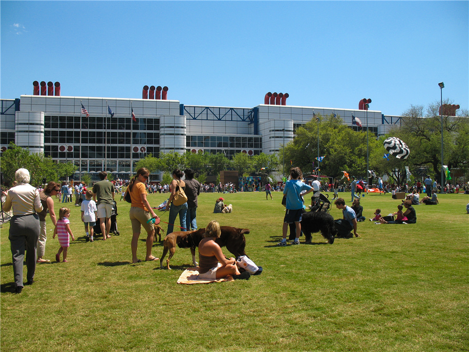 A hugely successful 12-acre park on the east side of downtown Houston, Texas, Discovery Green features a great lawn, amphitheater stage and bandstand, promenade, pond, interactive fountain, playground, gardens, dog runs, picnic areas, putting green, public art, two restaurants, a park office and restroom building, and a 600-car underground parking garage. Located adjacent to the George R. Brown Convention Center, the park has stimulated the development of an adjacent residential tower with ground-level retail, an office tower and two hotels while increasing convention business. Discovery Green features approximately 400 programmed activities annually and has been visited by millions since its dedication in 2008.