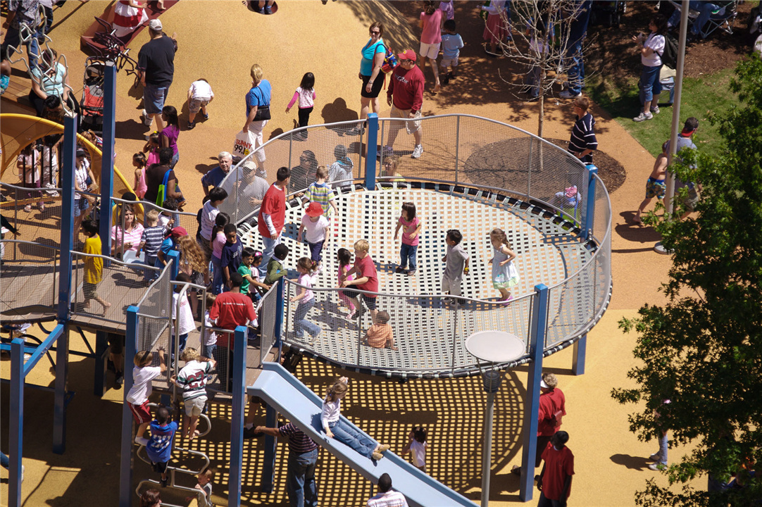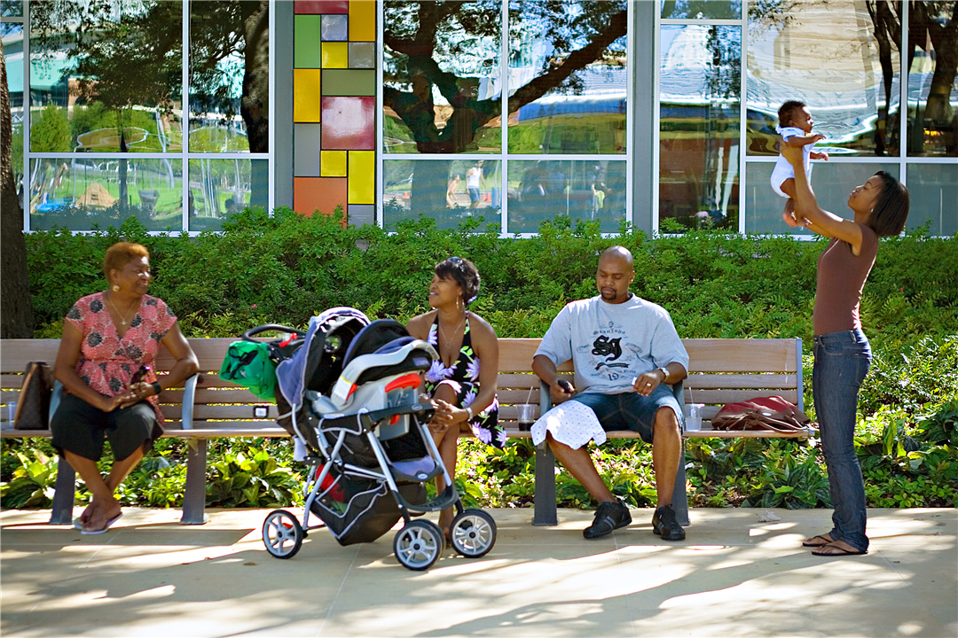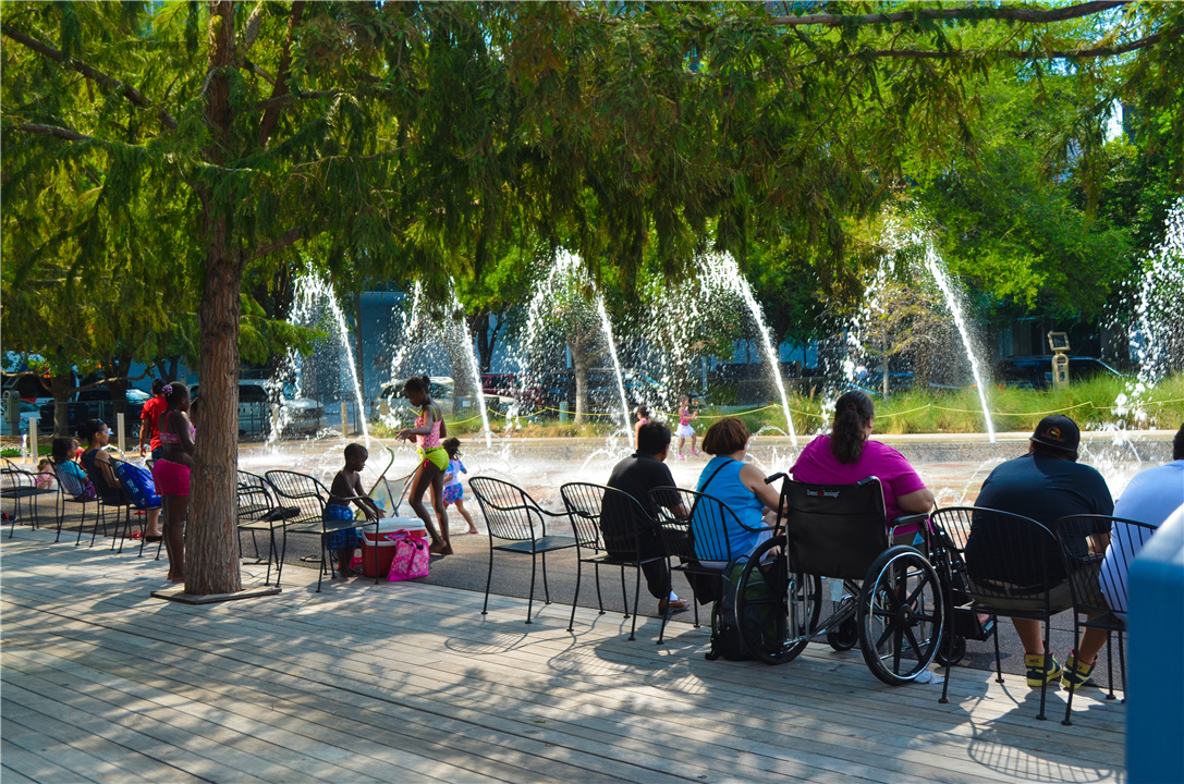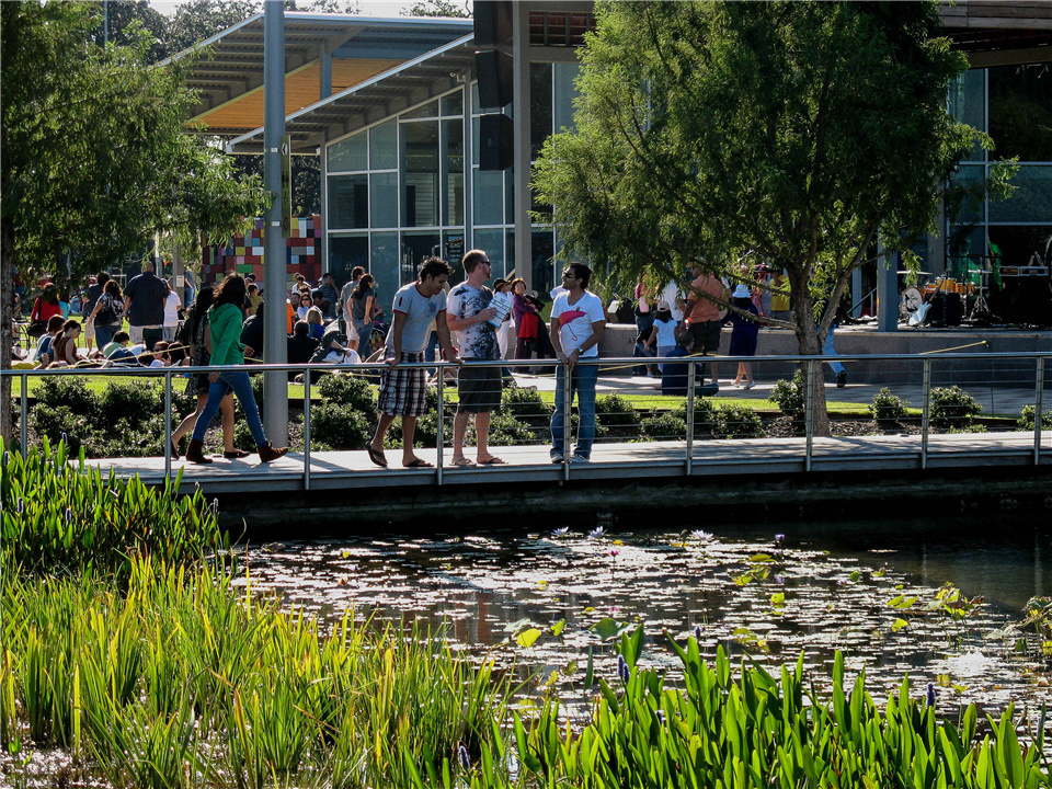 A hugely successful 12-acre park on the east side of downtown Houston, Texas, Discovery Green features a great lawn, amphitheater stage and bandstand, promenade, pond, interactive fountain, playground, gardens, dog runs, picnic areas, putting green, public art, two restaurants, a park office and restroom building, and a 600-car underground parking garage. Located adjacent to the George R. Brown Convention Center, the park has stimulated the development of an adjacent residential tower with ground-level retail, an office tower and two hotels while increasing convention business. Discovery Green features approximately 400 programmed activities annually and has been visited by millions since its dedication in 2008.