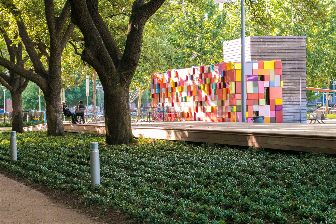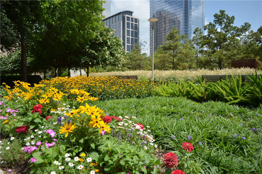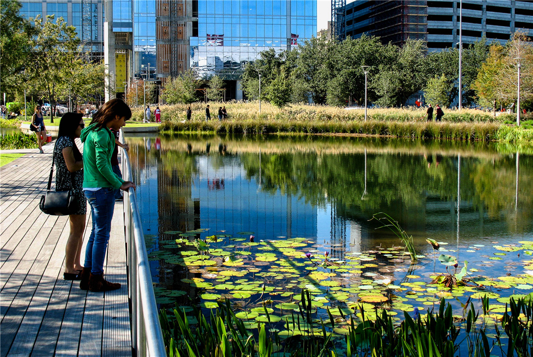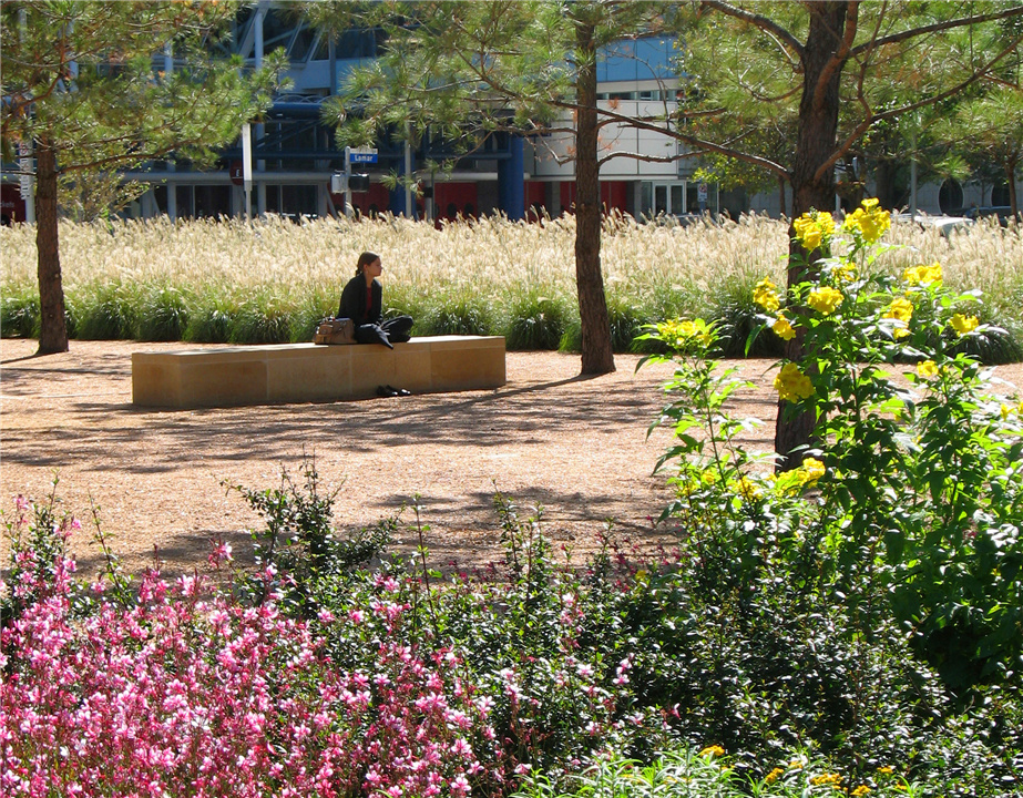 allee, and Red Oaks and Maples were transplanted from adjacent building sites. Approximately 85% of the more than 200 different species of plant materials specified for the park are native to Texas. The rich plant palette provides seasonal interest year-round for visitors and food and shelter for urban wildlife.
