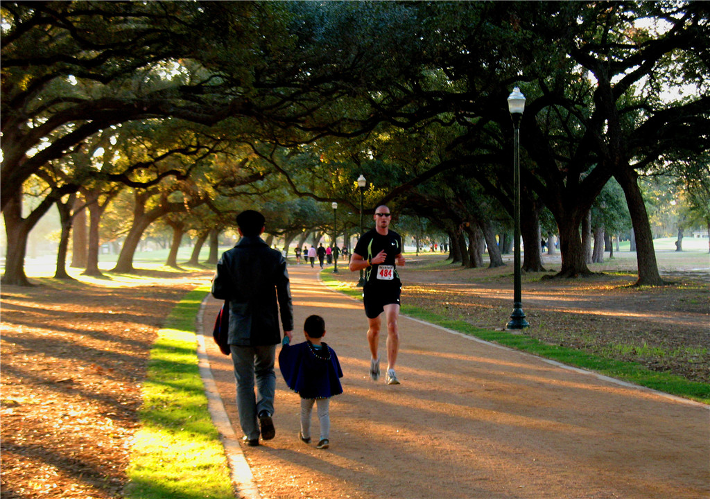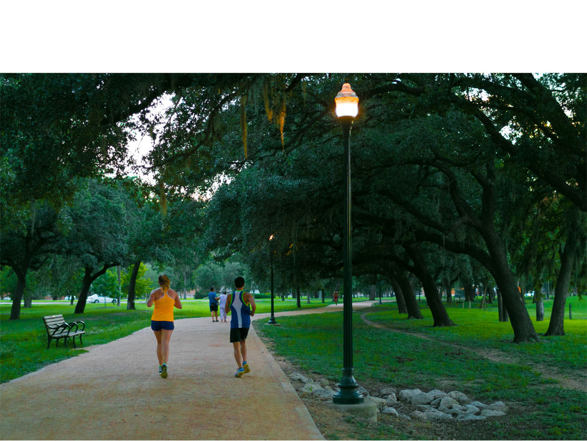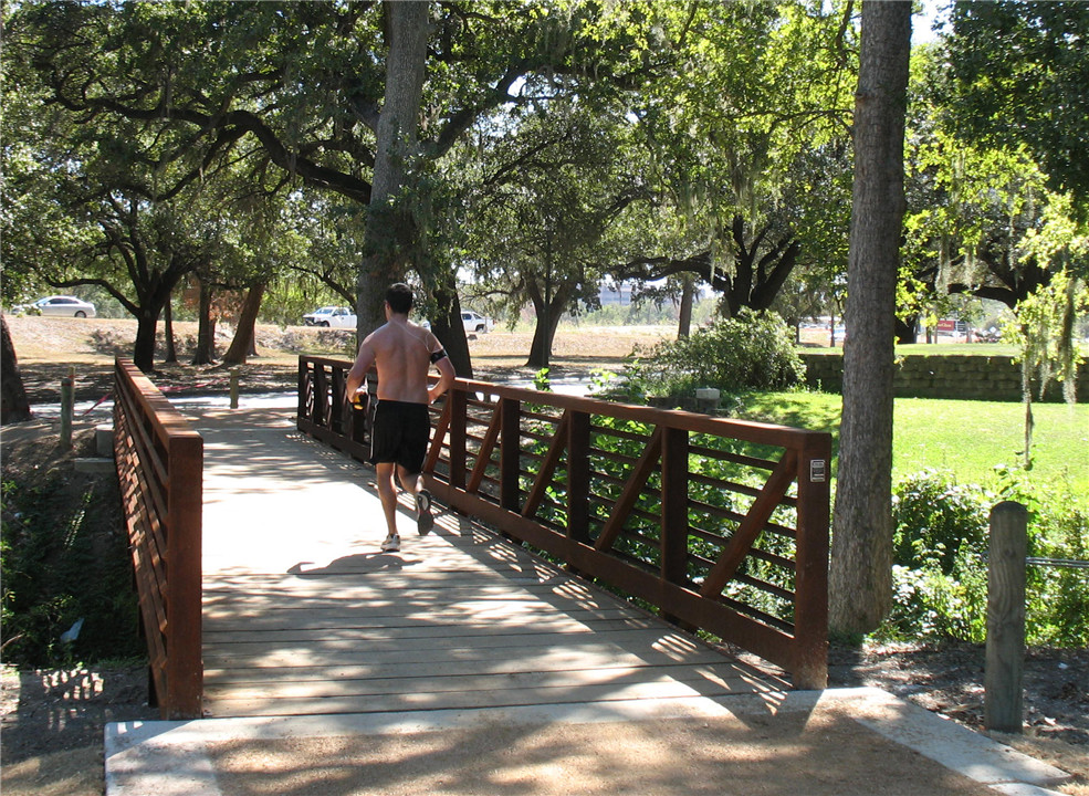 Winding through Houston’s historic Hermann Park, this 1.95 mile-long multi-purpose trail follows the route of the original carriage paths lined by huge Live Oaks. Exceptional care was taken to preserve the trees in the siting and construction of the trail and adjacent light standards. The decomposed granite trail is served by concrete trails that cross beneath a park road where steeper grades make erosion an issue. A rustic wood and steel bridge spans a ravine near the golf course.