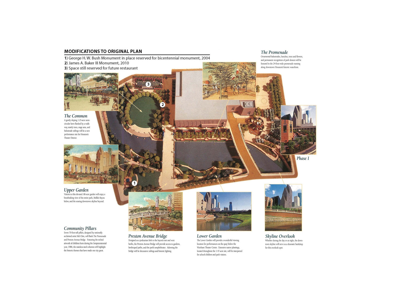 Lauren Griffith collaborated with Team HOU on the competition entry and initial phases and served as Landscape Architect for all phases of the project from 1986 - 2010. Ray + Hollington Architects was the lead consultant on Phase 2B, with Guy Hagstette, AIA, continuing to serve as design architect. Gensler was the architect for both monument projects.