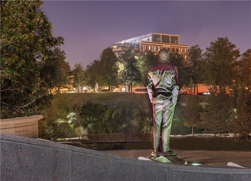 The George H.W. Bush Monument was added in 2004 to the highest point in the park, overlooking the city. A monument to his Secretary of State, James A. Baker, III and the Baker family was included in 2010. Sttatues of the two old friends from Houston face each other across the bayou.
